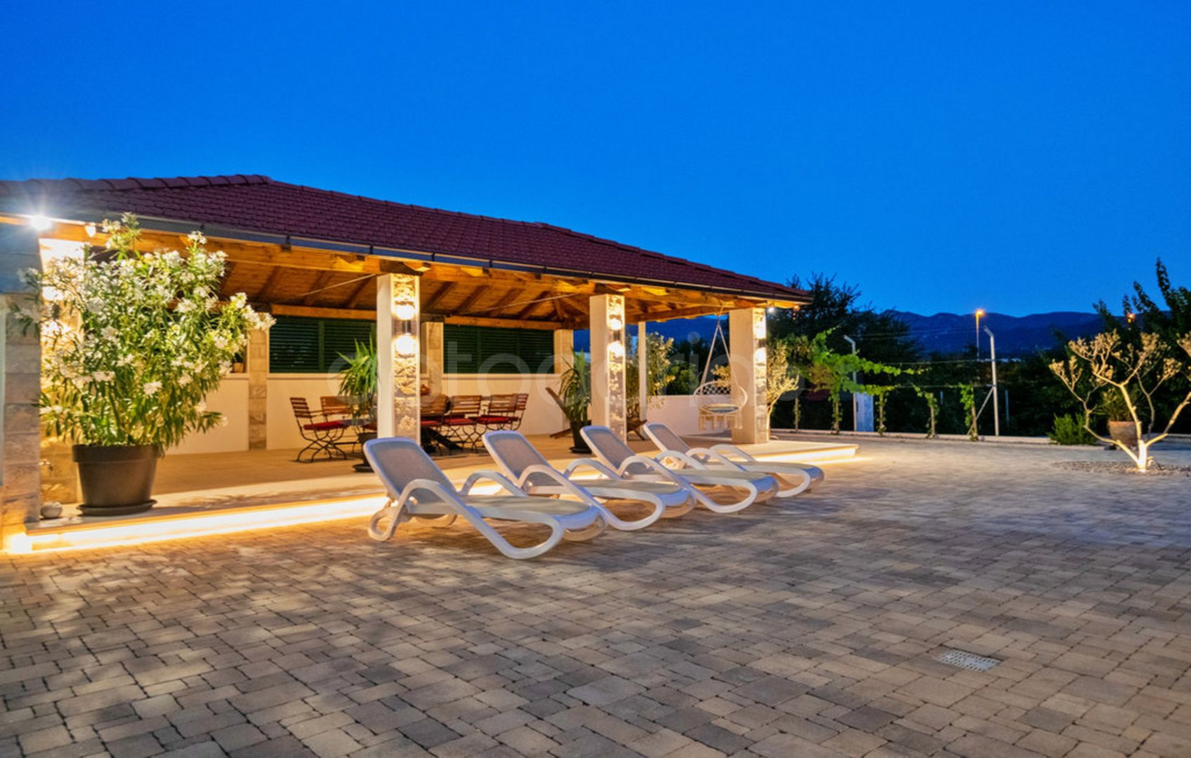 Terasa bazena sa ležaljkama, stolom i stolicama